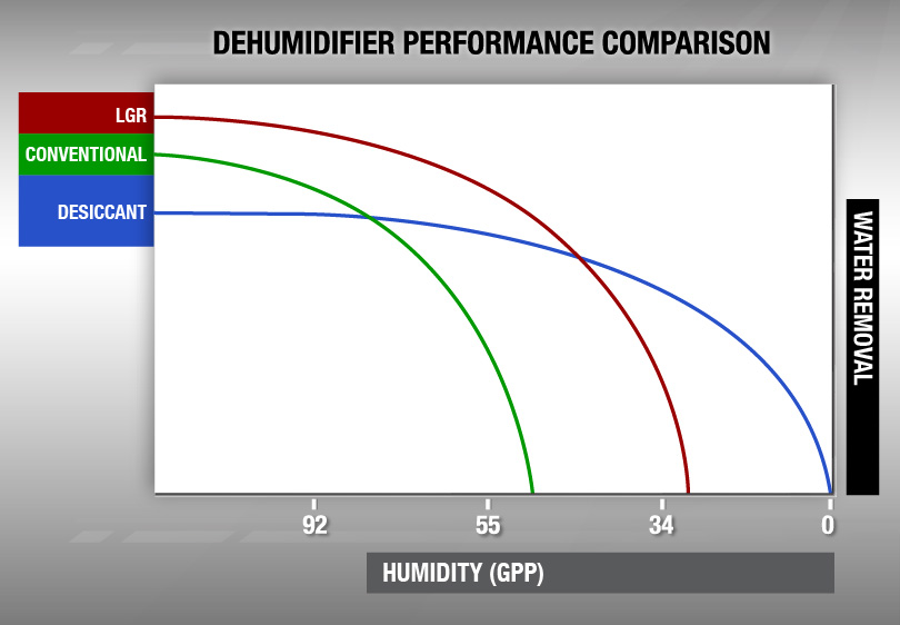 Desiccants remove moisture down to 0% RH. A standard refrigerant dehumidifier can no longer operate efficiently below about 30% RH, and a Low Grain Refrigerant unit will begin performing poorly below 20%.